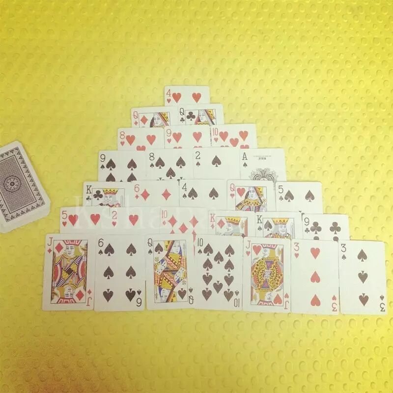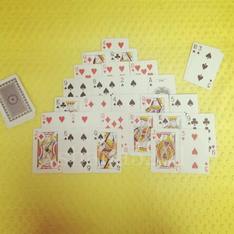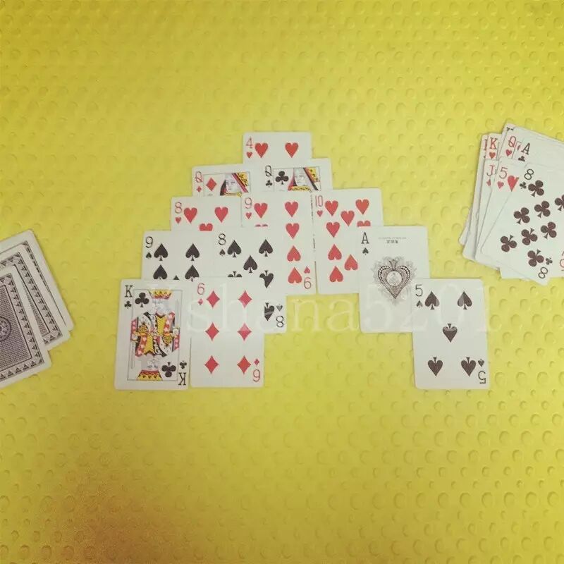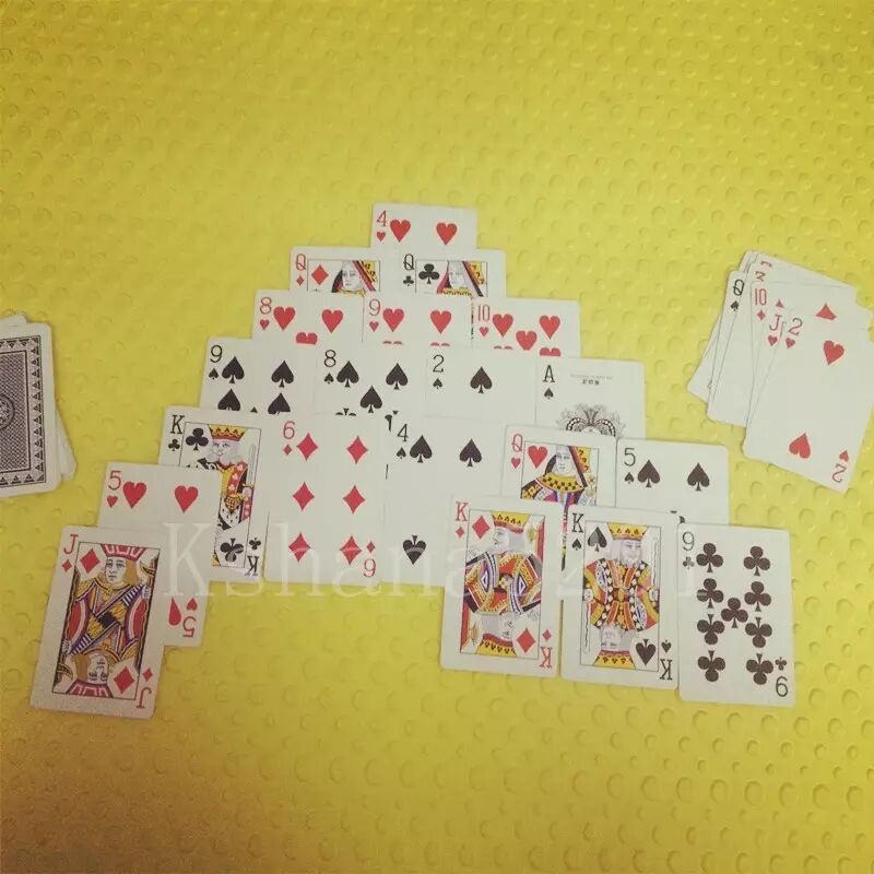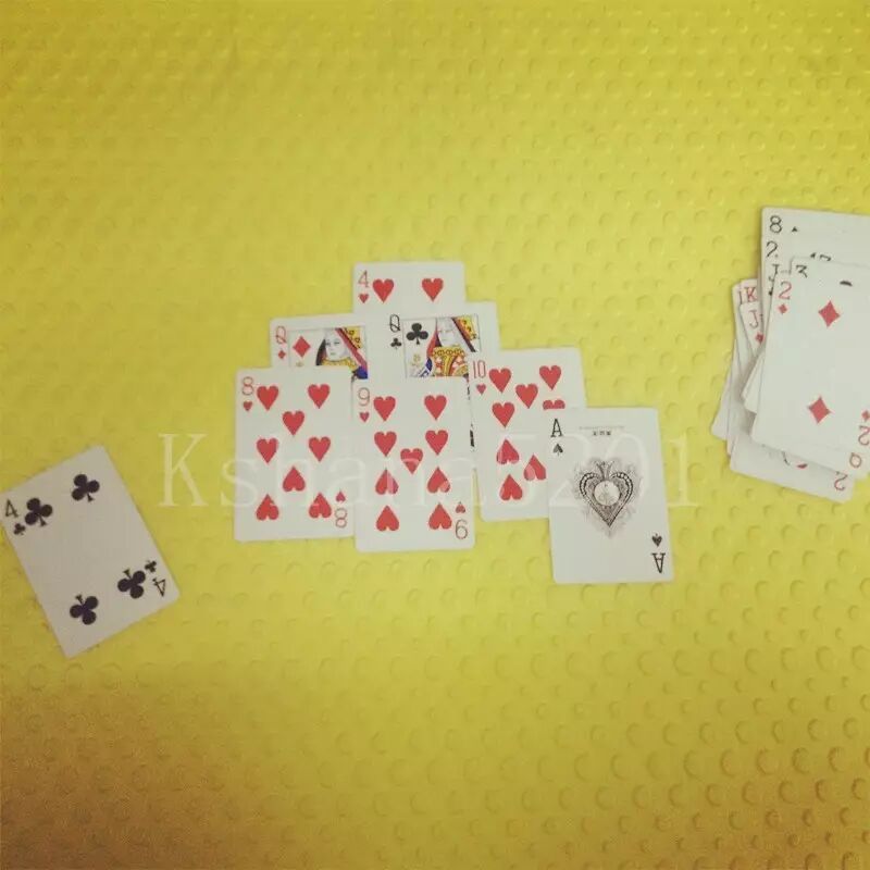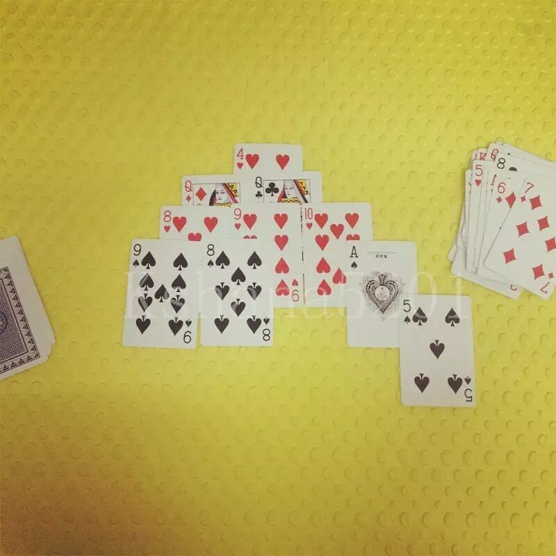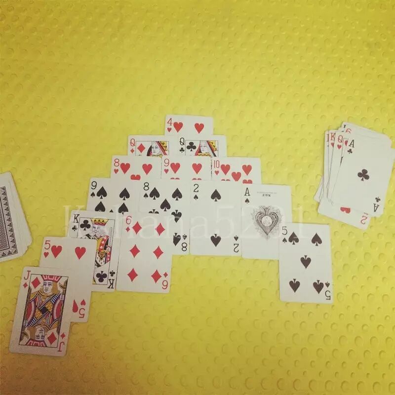 将所有牌依照图中的方式排列,从52张牌最上面依次取出排列。七排28张排为金字塔:第一排1张,第二排2张,第三排3张,每排各增加一张,一直排到第七排为止。所有的牌都是正面朝上的,后一排与前一排有些重叠压制哦。剩余的牌放在手中备用。(图中是放在一边)