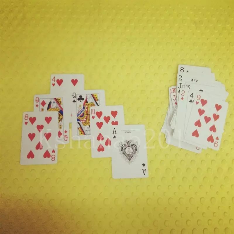 像这样一直抽到桌上的全部除去,或是手中的牌全部用光而桌上也没有可以除去的牌为止。如下图中所示,手中最后一张牌4和9除去后,桌上已经没有可以除去的牌了,占卜就结束了。